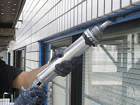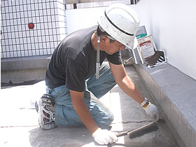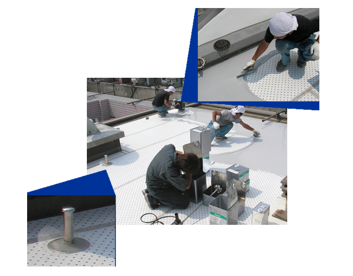 高圧洗浄後、防水材との密着性を高めるため下地処理材を塗布、その後通気緩衝シート接着剤を塗布します。通気緩衝シートとは、ポリエステル系不織布とポリエチレンフィルムを組合せたもので下地材との密着性をより確実にするため6mm径の穴が35mmのピッチで開けてあります。シートとシートの隙間を埋めるためジョイントテープを貼ります。右の写真は「目止め」と言って、通気緩衝シートに開いている6mm径の穴をウレタン防水材で埋め通気緩衝シート上を平滑にします。